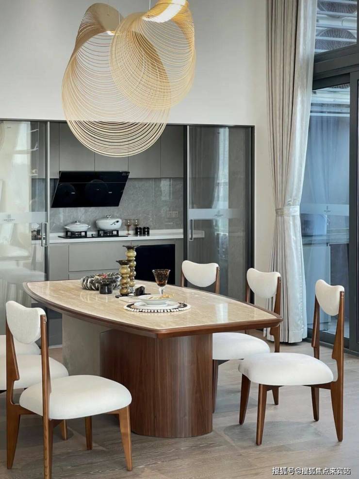通道与餐厅之间的视觉重点是葡萄牙的家居品牌Mezzo的Lester餐柜,这款独特的餐柜是对50年代和60年代致敬,以现代方式重新诠释复古经典。意大利设计师的创意悬浮餐厅吊灯,以其独特魅力照亮空间。自由曲线的设计,灵动而优雅。搭配大理石餐桌和原木餐椅,增添自然质感。在这里用餐不只是简单的行为,更是一场享受创意与舒适的美妙体验。