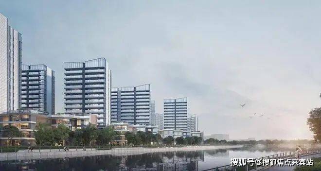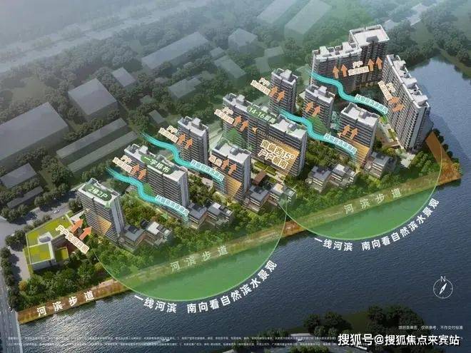 户型排布从石榴岗河自东向西依次升高,保证了约300米宽的生态水景面。