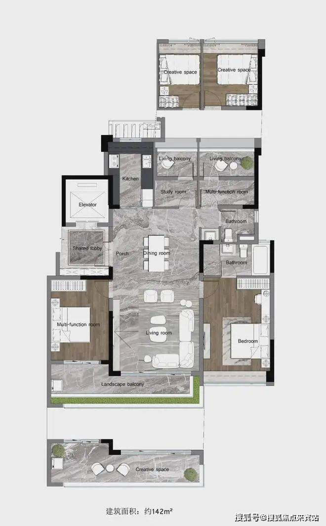 首先建面约142㎡四房有专梯入户,配有约7.9米景观阳台,连通次卧和客厅,客厅宽敞大气,而主卧开间约3.7米,配独立衣帽间和卫浴,厨房为U型设计,方便实用。