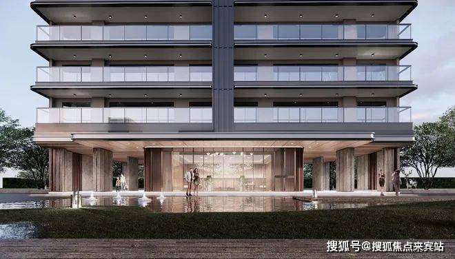 多层洋房正立面展现出水平方向的清晰结构,阳台界面以玻璃为主材,在自然光线下,透明介质弱化空间边界,消解多层的体量感,使建筑显得轻盈而优雅。古铜色金属线条纤细、清晰,搭配着浅灰色石材,为水平结构线增添视觉层次。建筑外墙材料采用灰色石材结合深灰色铝型材,辅以暖调的古铜色铝型材,细节丰富而和谐。