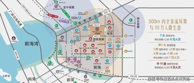 庞大常驻消费人口,近7所学校,楼下幼儿园、南侧一路之隔优质学校、东侧国际学校,大量师生人流汇集;7大高端社区毗邻,区域常驻消费人口达6万;周边4大前海文旅地标聚集,片区成为文旅目的地,消费力强劲旺盛。紧CBD写字楼群,前海合作区深港国际金融城入驻320余家金融机构。周边前海中冶大厦、中国国有资本风投大厦、前海太平金融大厦等办公楼,近享约50万庞大办公人群。