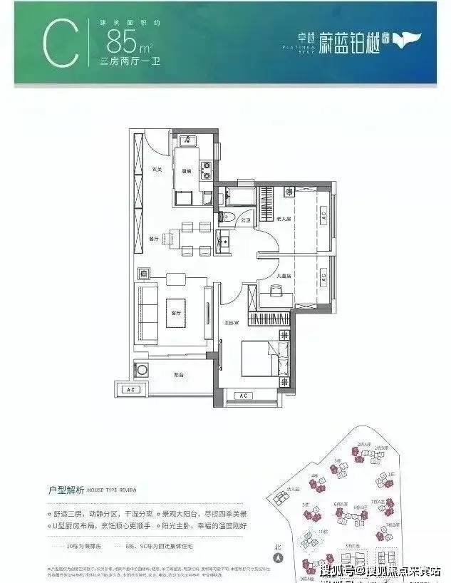 户型面积布局C85平三房两厅一卫
