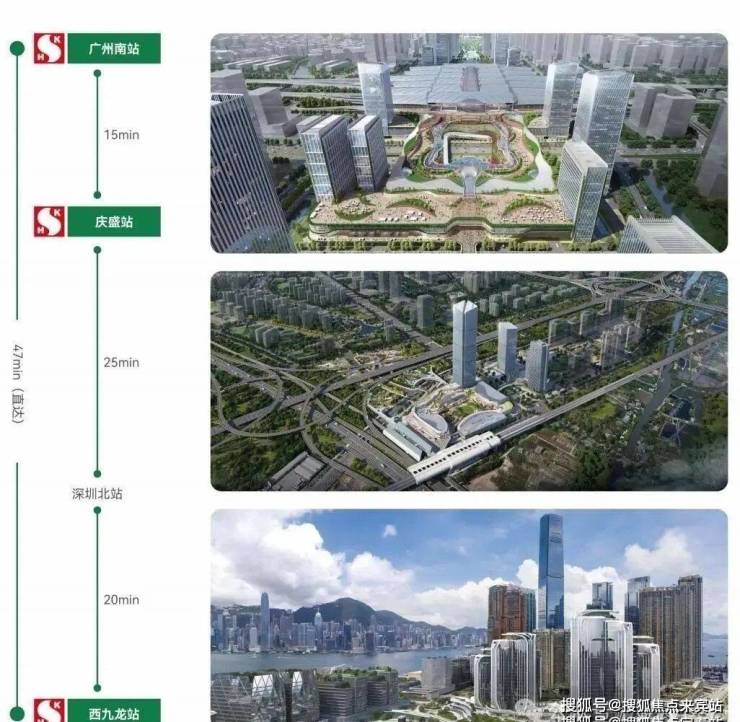 广深港高铁上汇聚新鸿三大TOD地标巨作(南站ICC-庆盛枢纽TOD-西九龙高铁站上盖发展项目),一轨之上港穗互联,比肩世界,实现双核驱动赋能发展。