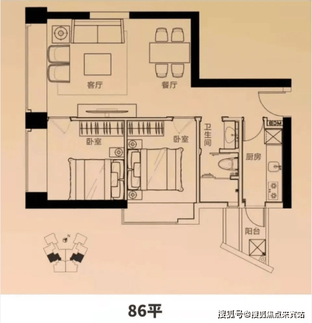 建面约86平大两房,南向阳台,阳光主卧,客餐直联,南北通透,空间感好,功能性强,居住体验非常舒适