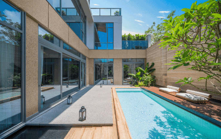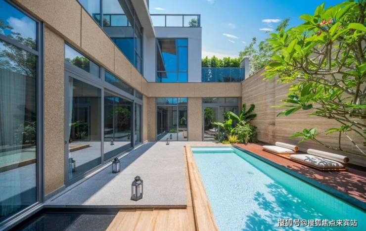 海棠春晓的精工品质匠心独具、真材实料。建筑设计拒绝批量化复制,每一席墅品均因地制宜定制化设计,建筑部分立面采用高档的蓝眼睛天然石料配以大面积玻璃,融入海南本土特有的火山岩及仿木纹铝板等精致装饰。