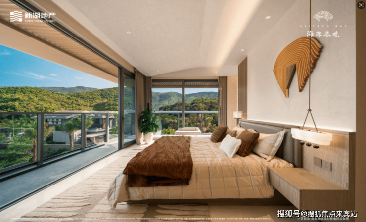 到了二层行政级主卧套房,以半开敞式设计, 3.3米的层高+落地玻璃窗 ,将采光面放大形成 270°视野 ,自由环揽半山峯景。