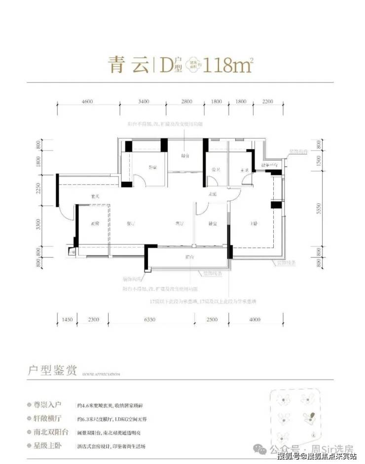 118㎡的4房2厅2卫,设计的是横厅南北通透格局,进门赠送约4.6㎡的入户玄关(不计算在户型图内),客餐厅6.35米开间,LDKB一体化设计,4个卧室分别做到了主卧22.5㎡/次卧11.56m²/次卧9.52㎡/次卧8.25㎡(包含墙体飘窗),主卧带设备平台,客厅连接次卧出6.25米长大阳台,L型厨房,得房率约81%(不含赠送),阳台主朝东南向。套内面积95.58m²+赠送面积31.04m²=实际使用面积126.62m²,加上赠送后得房率约107.3%。