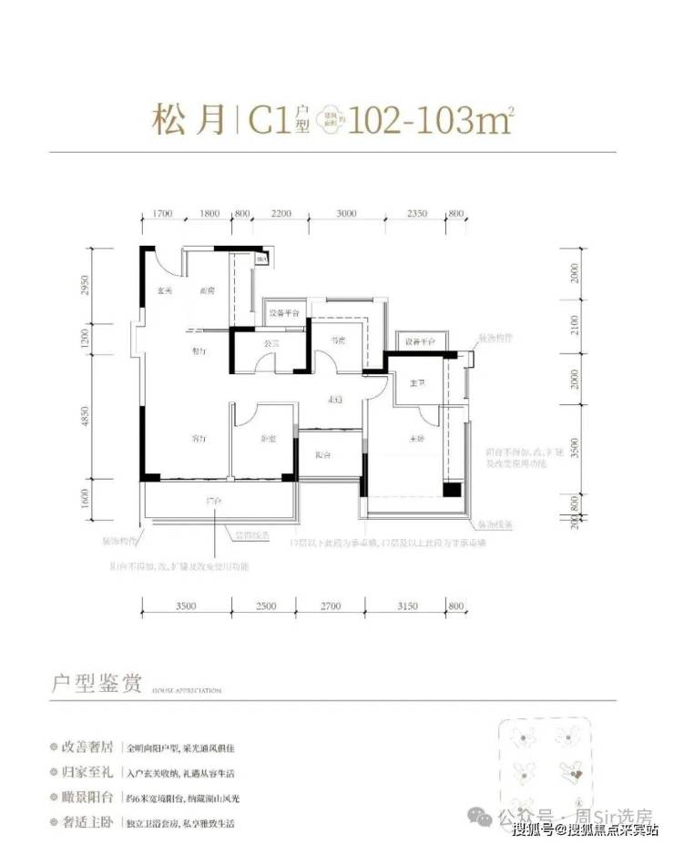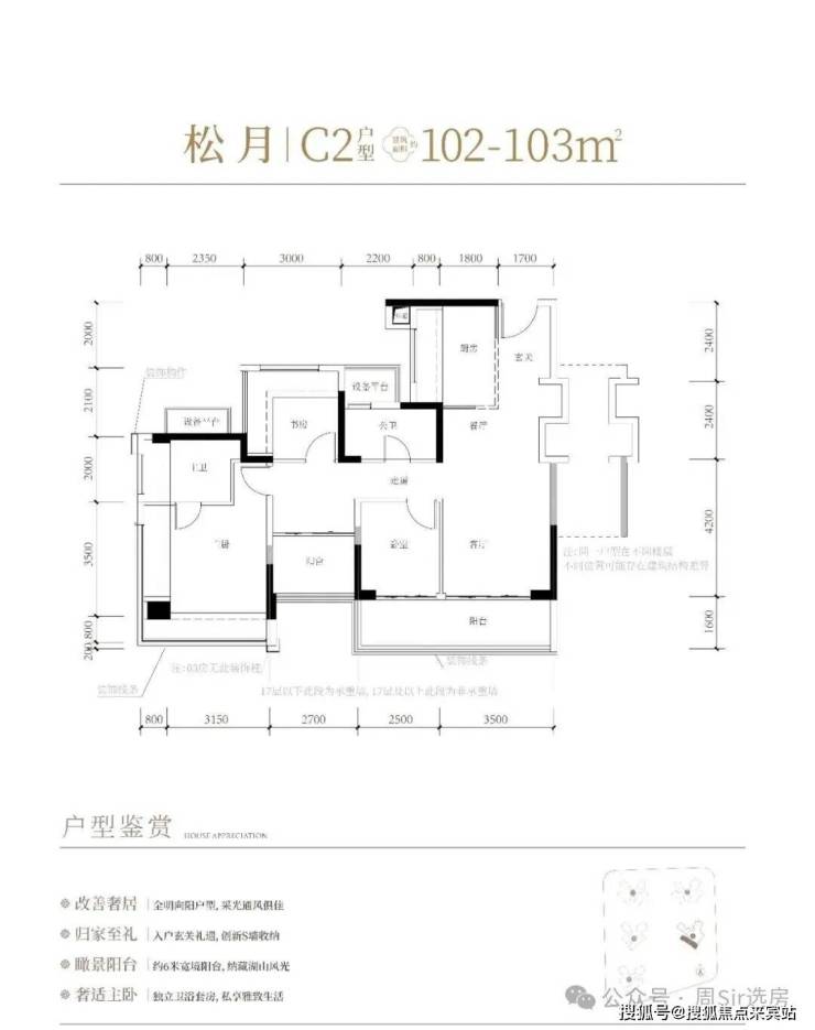 102-103㎡的4房2厅2卫,C1-C2户型,设计的是经典竖厅格局,进门入户玄关,客厅3.5米开间,LDKB一体化,S墙设计预留冰箱卡槽位,动静分区,四开间朝南,4个卧室分别做到了主卧17.98㎡/次卧8.37㎡/次卧8.1m²/次卧7.75㎡(包含墙体飘窗),L型厨房,公卫干湿分离带1个约2m²的设备平台,得房率约81%(不含赠送),客厅连接次卧出9.6m²的观景大阳台,东南或西南朝向。套内面积83.43m²+赠送面积23.86m²=实际使用面积107.29m²,加上赠送后得房率约104.16%。