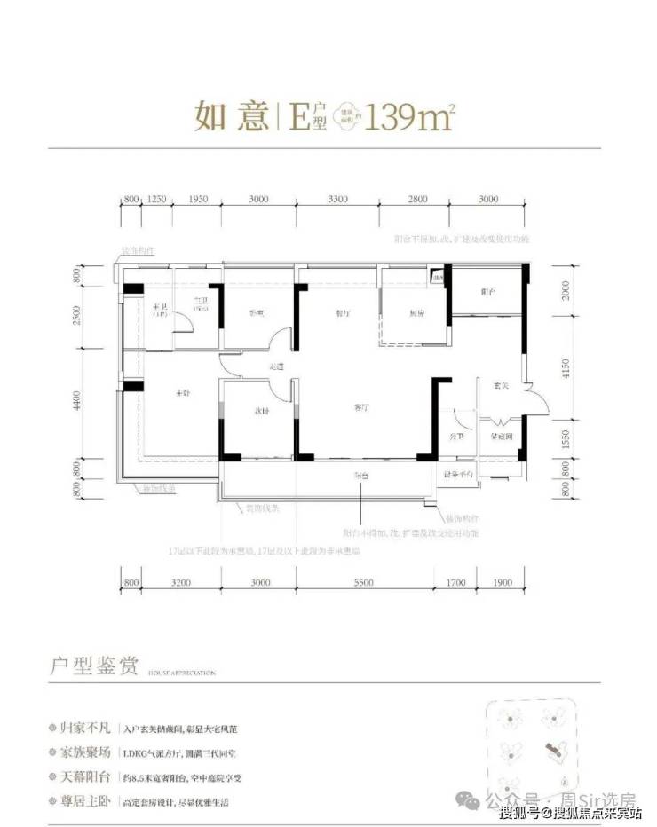 139㎡的4+1房2厅2卫,设计的是竖厅南北通透格局,进门赠送约5.2㎡的入户玄关(不计算在户型图内),客厅5.5米开间,LDKB一体化方厅设计,5个卧室分别做到了主卧27.56㎡/次卧10.2m²/次卧9.9㎡/次卧9.9㎡/次卧4.46m²(包含墙体飘窗),L型厨房,得房率约81%(不含赠送),客厅连接次卧出13.6m²的观景大阳台,主朝西南向。套内面积112.59m²+赠送面积31.98m²=实际使用面积144.57m²,加上赠送后得房率约104.01%。