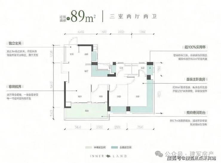 89㎡的3房2厅2卫,设计的是竖厅格局,客厅3.4米开间,LDKB一体化,S墙设计预留冰箱卡槽位,四开间朝南,动静分区,主卧270°无柱转角飘窗,分别做到了主卧17.32㎡/次卧9.62㎡/次卧6.2㎡(包含墙体飘窗),U型厨房,卫生间干湿分离,超100%得房率(包含赠送),客厅连接次卧出5.7米长的大阳台,东南朝向。