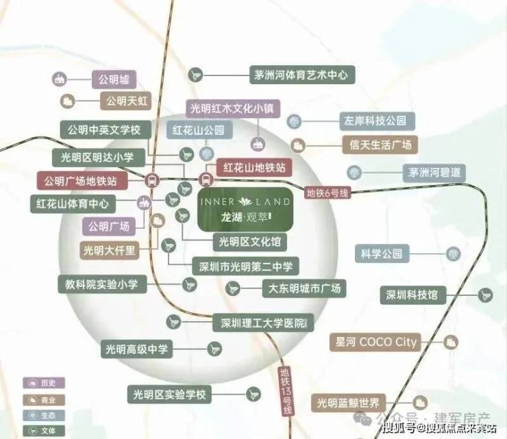 地块2km范围内集合了红山体育中心、光明区少年儿童图书馆、公明广场、红花山公园、楼村湿地公园、公明中学、公明中英文学校、光明高级中学、光明区第二中学、深圳理工大学明珠校区、大仟里购物中心、光明人民医院西院区等成熟生活及市政配套,教育资源尤为丰富。