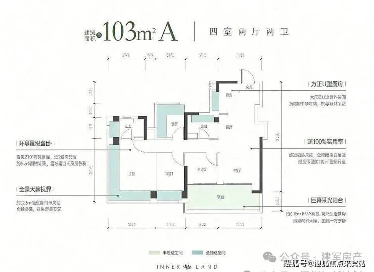 103㎡的4房2厅2卫,设计的是竖厅格局,客厅3.5米开间,LDKB一体化,S墙设计预留冰箱卡槽位,四开间朝南,动静分区,主卧270°无柱转角飘窗,分别做到了主卧18.63㎡/次卧10㎡/次卧8.48㎡/次卧7㎡(包含墙体飘窗),U型厨房,卫生间干湿分离,超100%得房率(包含赠送),客厅连接次卧出6.15米长的大阳台,东南或西南朝向。