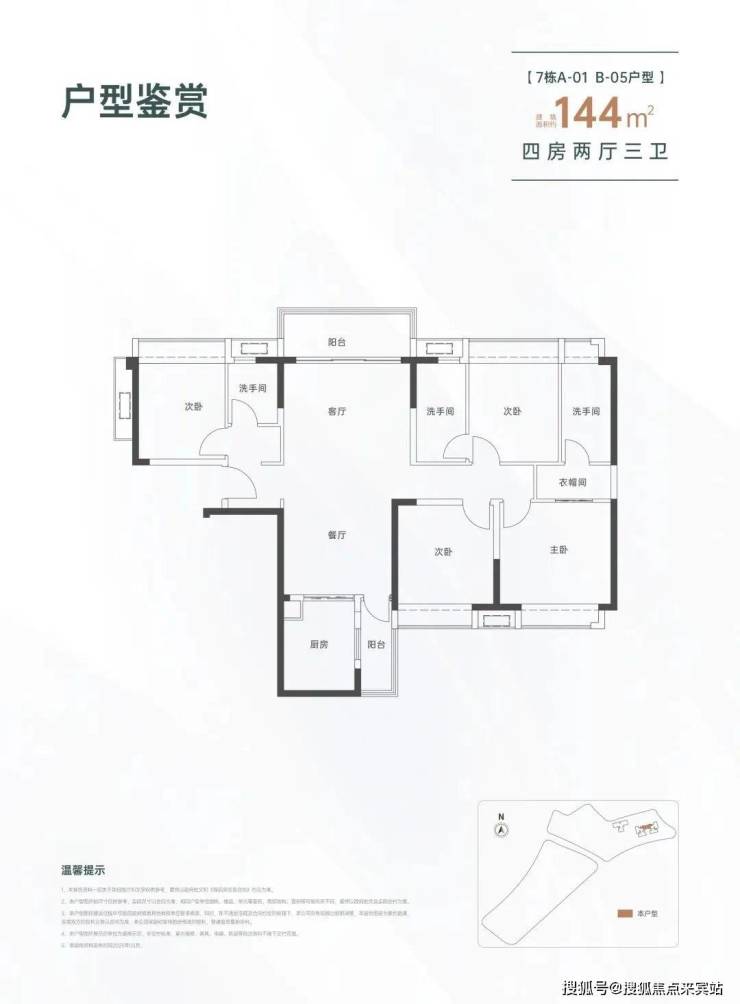 144㎡的4房2厅3卫,设计的是竖厅南北通透格局,进门入户玄关,LDKB一体化设计,双主卧套房,L型厨房还带1个生活阳台,公卫干湿分离,得房率约82%(不含赠送),阳台主朝西北向。