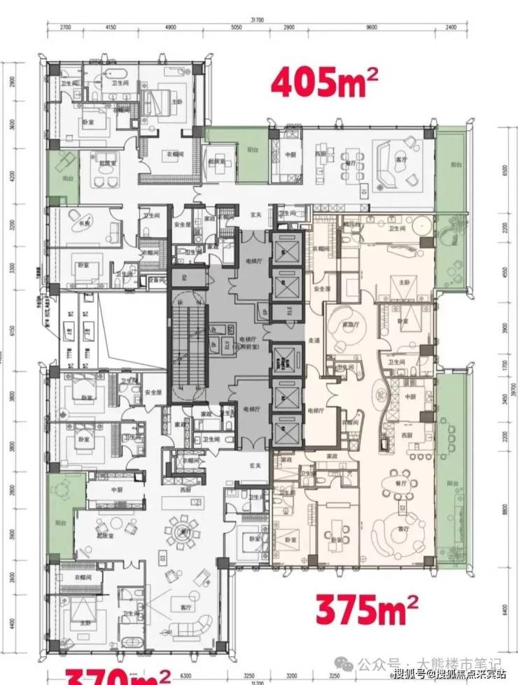 高区,约370-375-403㎡三个户型,面积来到一个新层次,空间感更强。