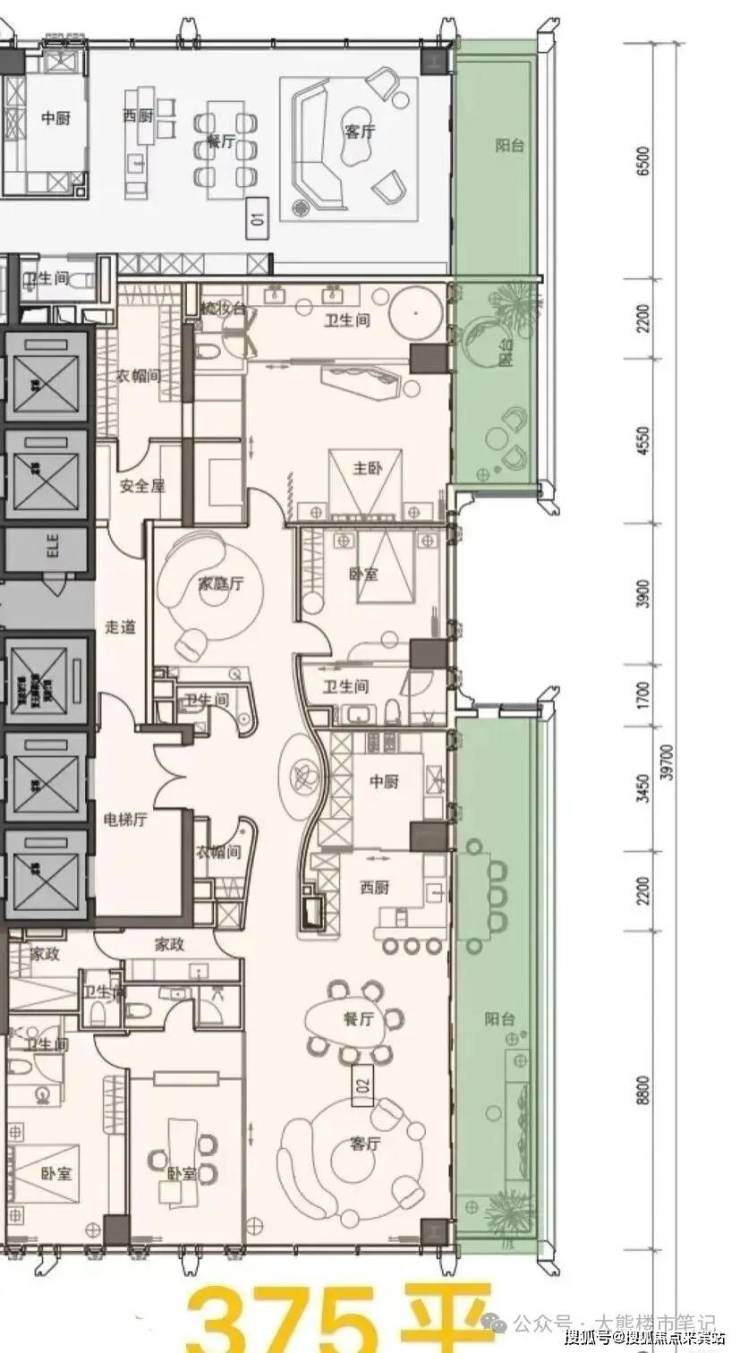 像375㎡户型,4+1房5卫设计,4个套间,约14.45米超长阳台可改造空中花园。