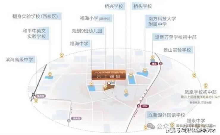 项目自带 9 班制幼儿园,与深圳市福海中学一街之隔,约 1 公里范围内分布幼儿园、小学及中学 10 余所,其中桥头学校为九年一贯制公立学校,福海小学(建设中)拟设 24 班 1080 个学位。