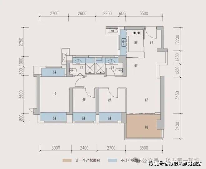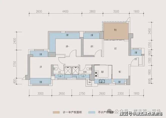 3室2厅2卫,南北通透,客餐厅5.6米宽,带11㎡阳台。主卧及次卧双飘窗,全屋12个飘窗。L型厨房,可改4房,赠送面积24㎡,得房率104.44%(含赠送)。
