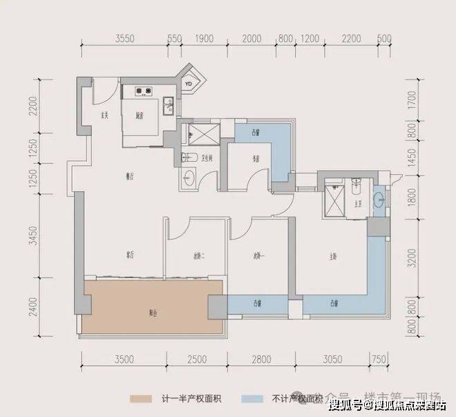 3房2厅2卫,西南向,竖厅格局,客厅3.5米宽,三开间朝南。主卧15.1㎡带270°飘窗。赠送面积16.96㎡,得房率96.84%(含赠送)