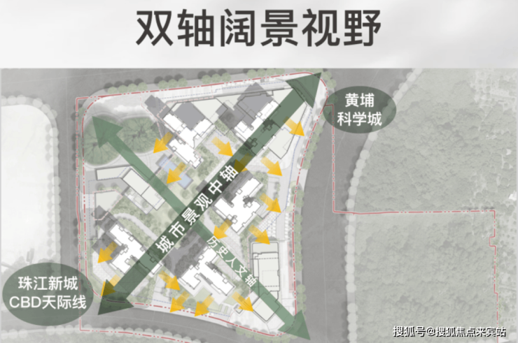 全点式布局,楼体错落无对视;楼型48°设计,形成极致景观视野,目之所及皆风景;双轴景观中轴,一轴历史人文生活轴线,一轴珠江新城CBD与黄埔新城磅礴天际线,一览无余。
