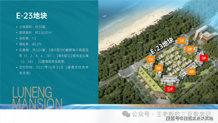 项目地址:红塘湾旅游度假区红塘湾大道十横路开 发 商:中国绿发在售地块:E23地块占地面积:35亩建筑面积:2.82万㎡ 绿 化 率:40% 容积率:1.2总 套 数:共324套交房时间:现房(硬装交付含中央空调)物业费:4.8元/㎡在售户型: 5栋9层住宅楼共180套(1,2,4,6,7#楼);2栋8层商业公寓共122套(3、5#楼);22套独栋商业别墅