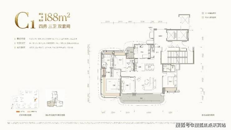 C1户型:建面约188㎡四房三卫双套间,东南朝向,主阳台开间约:9.5米,客餐厅开间约:6.4米,3梯3户每户都拥有独立私家门厅,私密性高,客厅设计了多功能空间,兼顾书房、茶室等需求,188㎡可以做到4+1房,中西双厨大阳台,满足三代同堂大家庭居住需求,户型除了注重实用性,东南朝向可以看海景、摩天轮、城市等复合景观,在168㎡基础上扩容约20㎡,不增房间数,只升级舒适度,更适合追求奢阔尺度的改善家庭。户型延续双套间格局,客餐厅尺度全面进阶,横厅面宽与进深进一步放大,即便摆放大型家具,过道依然从容通透,家庭聚会、社交待客均不显局促。简单来说,这是168㎡户型的全面放大版,每一处空间都更舒展,居住体验更显从容。