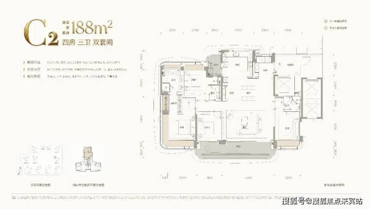 C2户型:建面约188㎡四房三卫双套间,西南朝向,和C1户型类似,在阳台朝向和入户门位置有所区别。