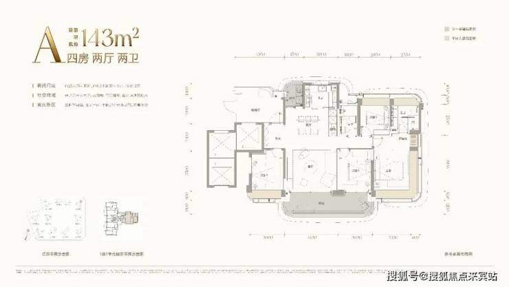 A户型:建面约:143㎡(四房两卫),主阳台开间约:7.8米,客餐厅开间约:4.8米,3梯3户,专属电梯厅,143㎡四房两卫的设计,多孩家庭轻松入住,户型兼顾实用性同时,东南朝向大阳台,看海景同时看摩天轮的景观,城市夜景也很美,是整个小区面积最小且景观最好的户型。