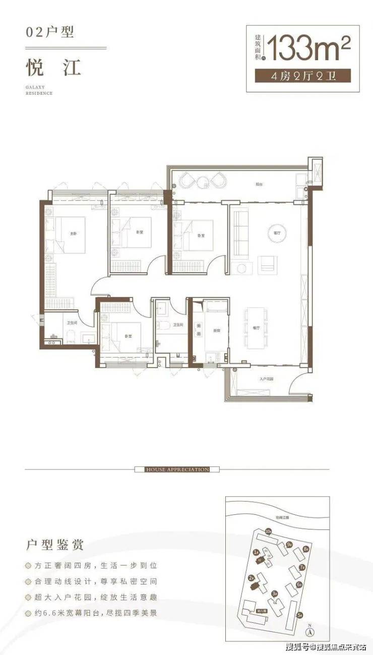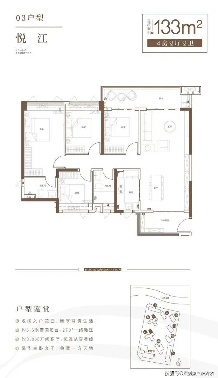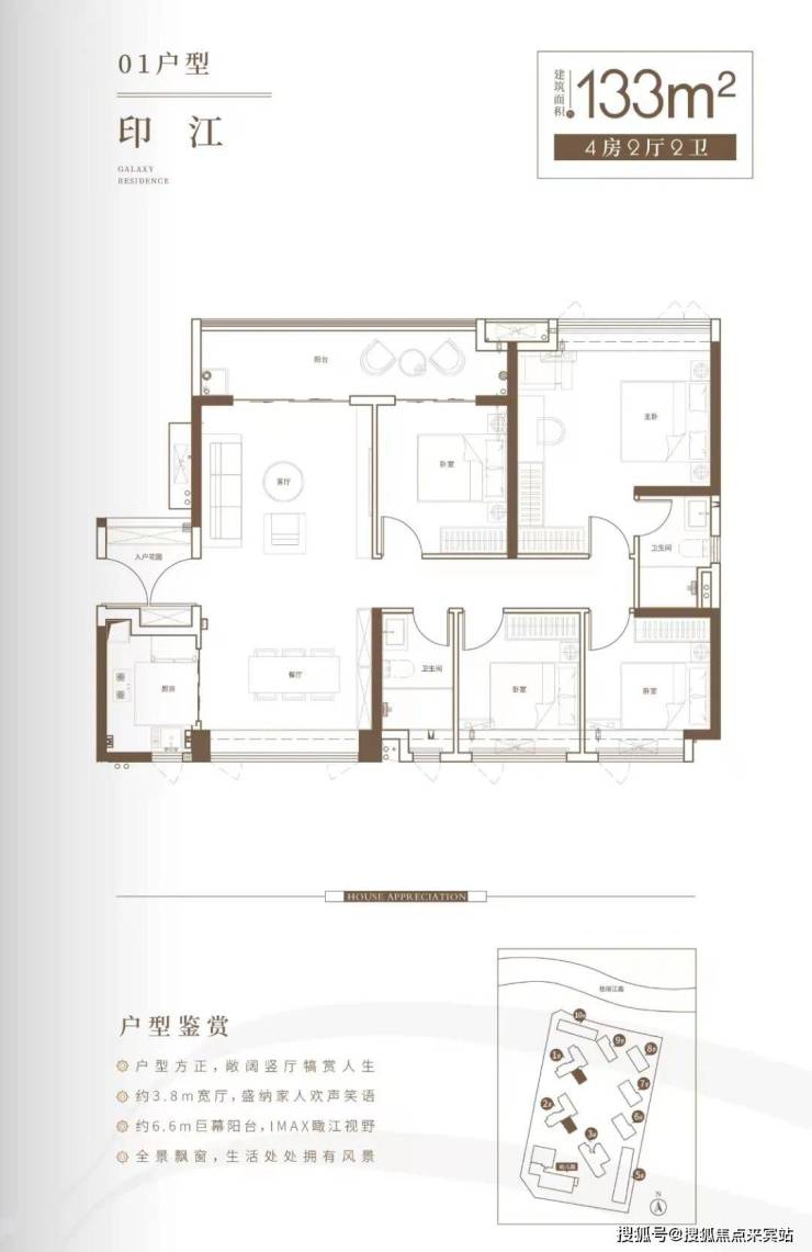 项目打造建筑面积约99-133㎡瞰江三至四居,户户奢阔大阳台,一线江景视野,300米壮阔江景,超乎想象的生活体验。