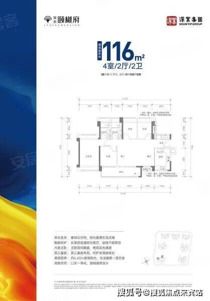 建面约116㎡四房两厅两卫:全南朝向,横厅南北通透格局,客餐厅5.7米开间,主卧南北通透设计,4个卧室均含墙体飘窗,U型厨房,干湿分离卫生间。