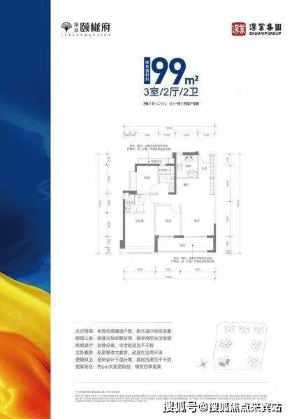 建面约99㎡三房两厅两卫:全南朝向,竖厅格局,三开间朝南,客厅连接次卧出6米长的大阳台,主卧套房设计,公卫三段式分离。
