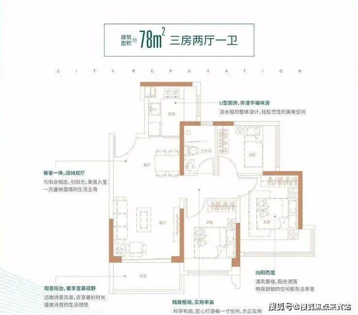 78㎡的3房2厅1卫,设计的是经典竖厅格局,客厅3.4米开间,LDKB一体化,动静分区,三开间朝南,主卧270°转角飘窗,L型厨房,卫生间干湿分离,得房率:74.71%(不含赠送),西南或东北朝向。