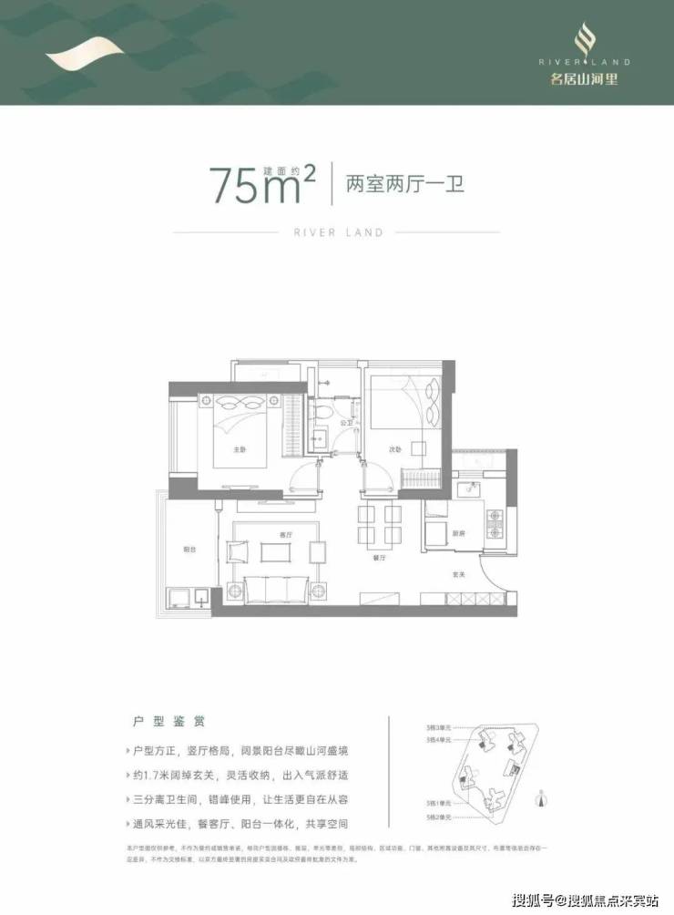 75㎡的2房2厅1卫,设计的是竖厅格局,客厅3.3米开间,LDKB一体化,2个卧室分别做到了主卧9.6㎡/次卧8.88㎡(套内面积,包含墙体),L型厨房,卫生间干湿分离,