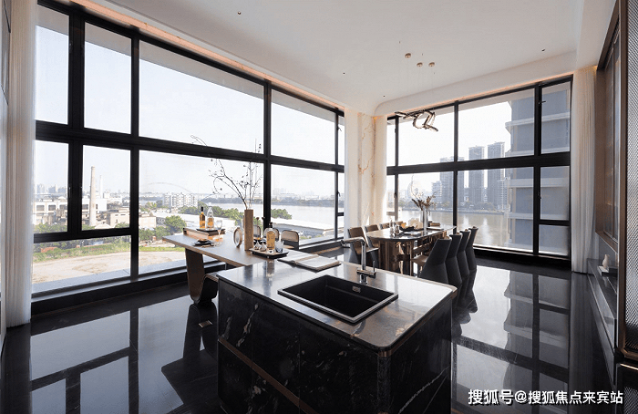 4.5米层高的餐客厅,采用L型的双面落地窗,实现环幕式的江景视野,豪宅的霸气感一览无遗。