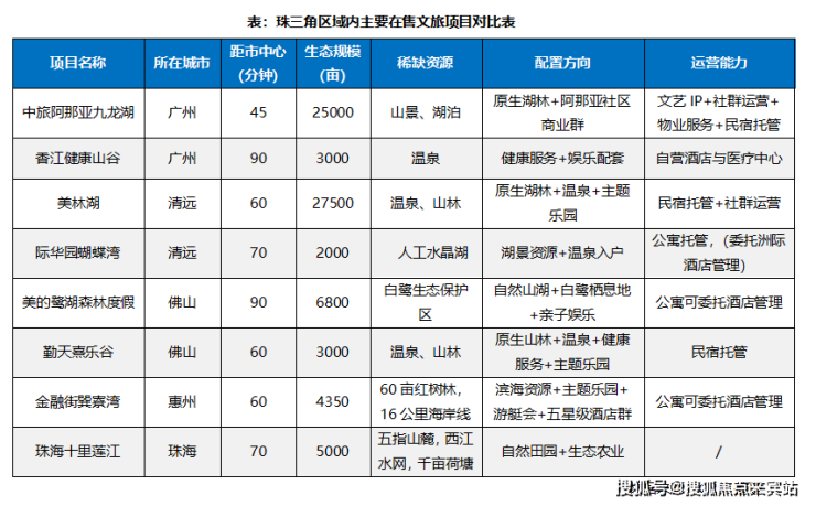 从珠三角在售旅游地产竞品对比看,中旅阿那亚九龙湖项目差异化优势体现在:区位、生态规模、商业配置、中旅投资的实力和阿那亚的运营能力。