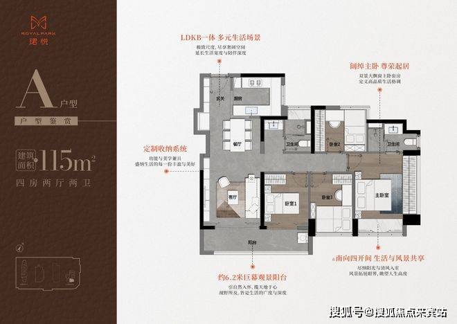 主力改善户型,东南向A户型四开间朝南,12.8米采光面搭配6.2米巨幕阳台;西南向B户型端头位,全明通透无西晒,使用率92%,预留定制收纳空间,适配三代同堂家庭。
