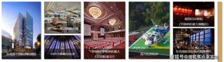 约30万平的购物公园国贸城;东莞首家五星级国际品牌酒店——洲际酒店进驻,业主可直接享受酒店送餐服务;配备美术馆;配备直升机停机坪等等……