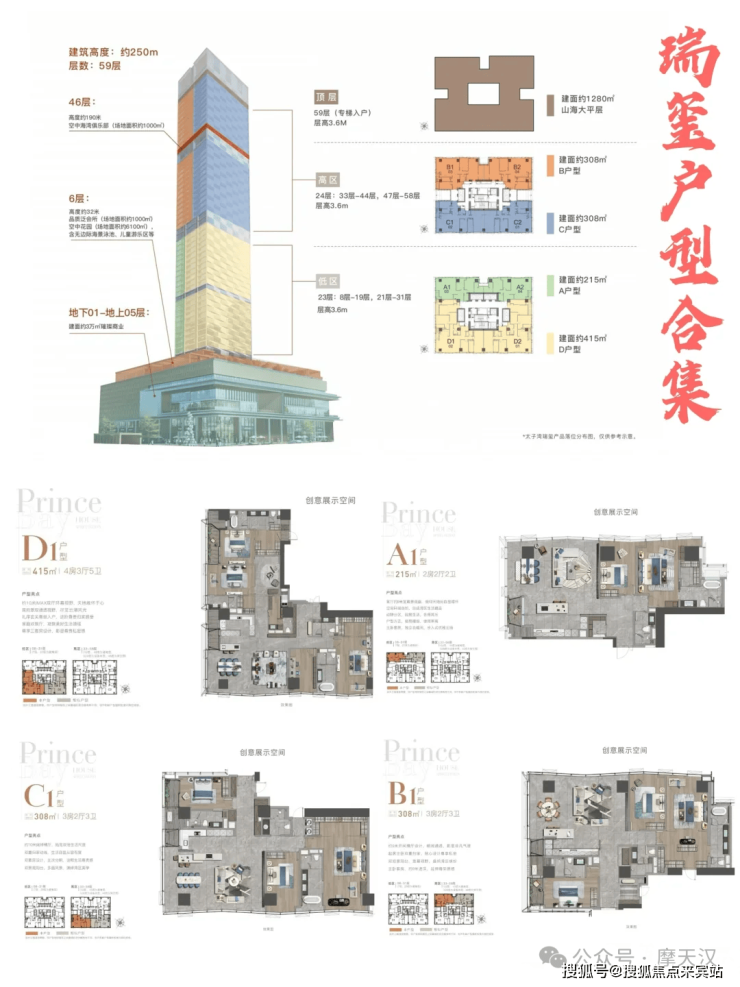 项目打造主力建面约215-415㎡纯粹品质公寓共191伙,位于顶层第59层为建面约1270㎡大平层鼎豪公寓产品。