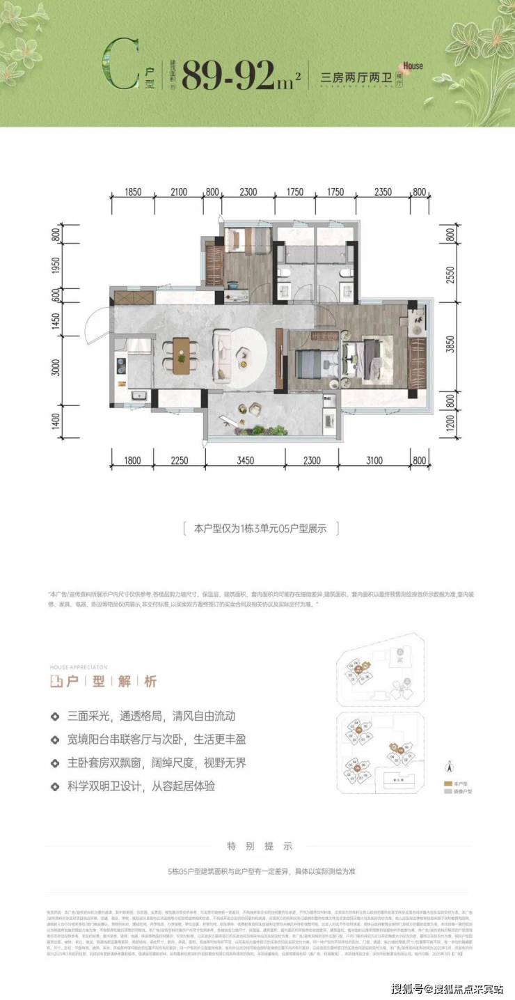 89-92㎡的3房2厅2卫,B户型,设计的是竖厅格局,客厅3.45米开间,LDKB一体化,S墙设计预留冰箱卡槽位,三开间朝南,动静分区,主卧270无边转角飘窗,3个卧室分别做到了主卧18.1㎡/次卧9.44㎡/次卧5.98㎡(包含墙体飘窗),客厅连接次卧出5.75米长的大阳台,U型厨房,公卫三段式分离,得房率约93-99%(包含赠送),西南或东南朝向。