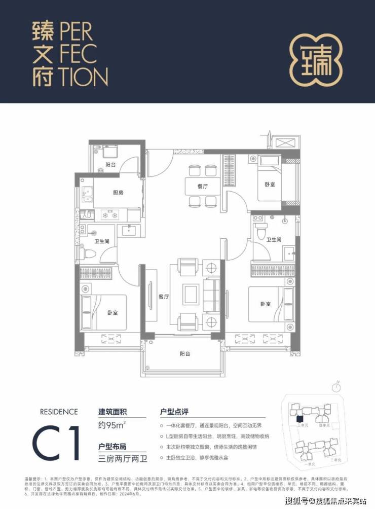 95㎡的3房2厅2卫,设计的是竖厅双龙抱珠格局,一体化客餐厅,三开间朝南,L型厨房还带1个小生活阳台,公卫三段式分离设计,阳台朝东南向。