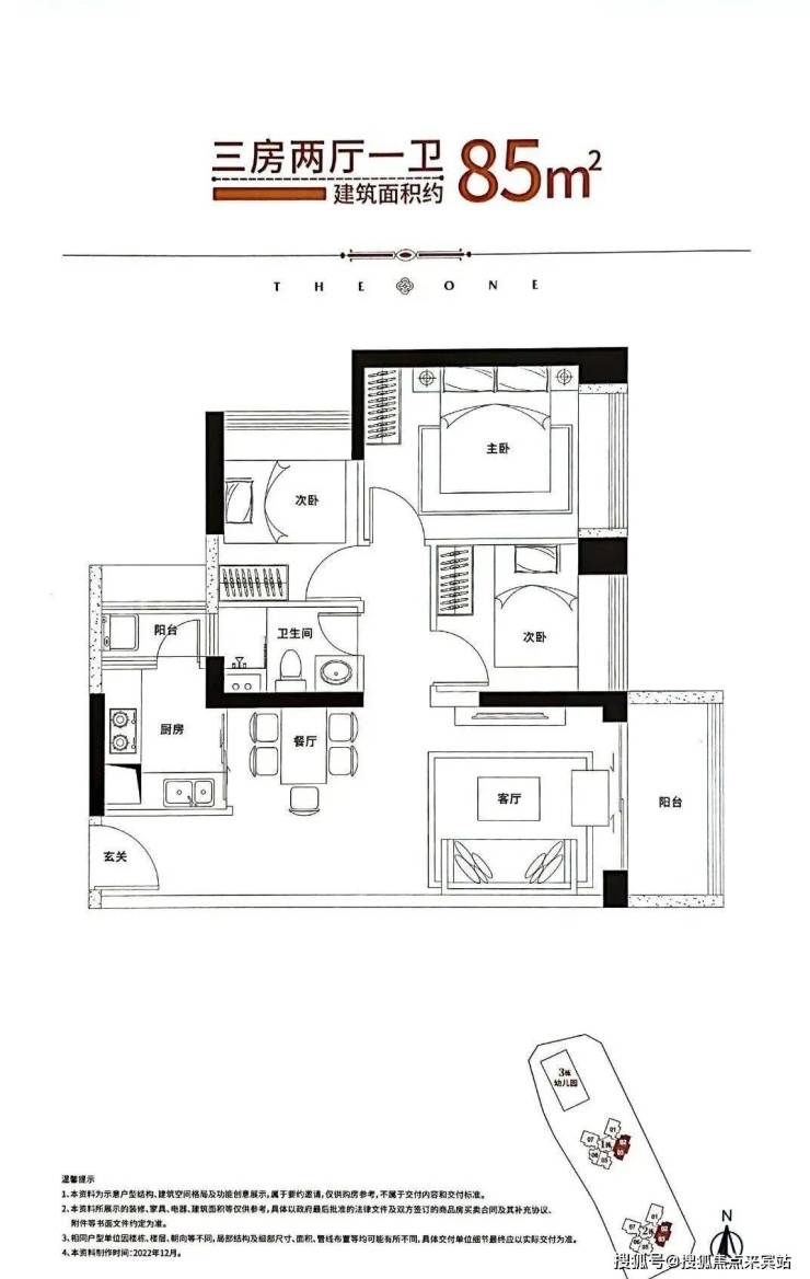 85㎡舒居三房户型,单价4.94-5.63万,418-477万;