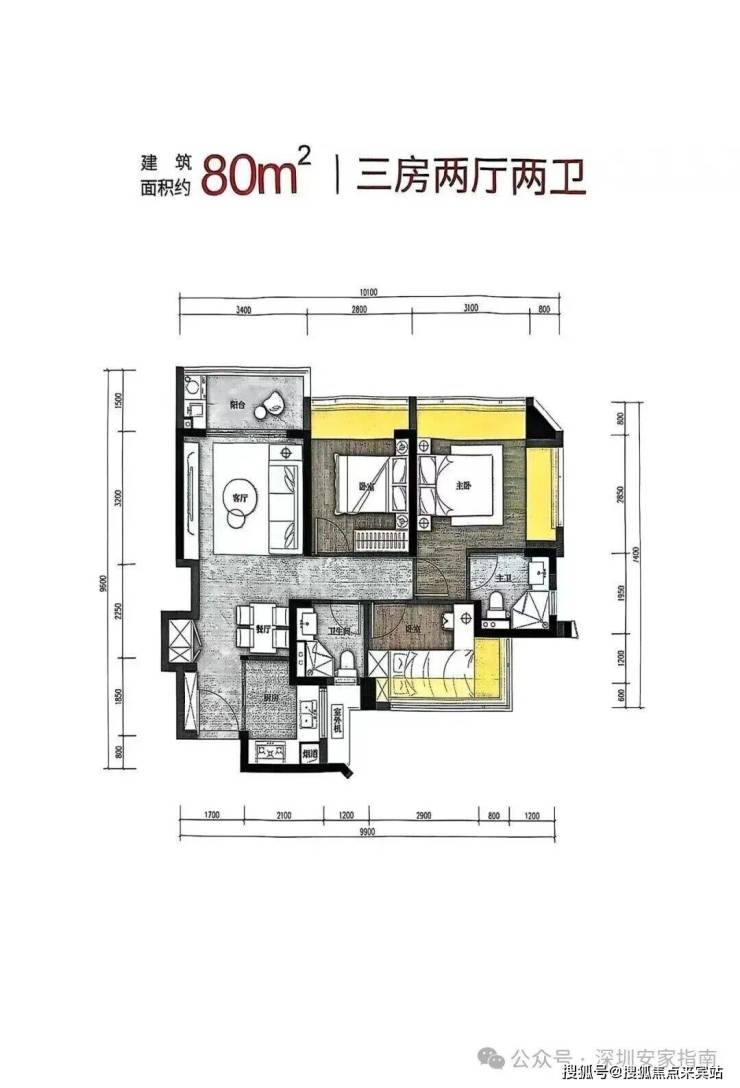 80㎡的3房2厅2卫(新增户型),设计的是竖厅格局,客厅3.4米开间,LDKB一体化,S墙设计预留冰箱卡槽位,动静分区,U型厨房,卫生间干湿分离,得房率约79.6%(不含赠送),阳台4东北朝向。