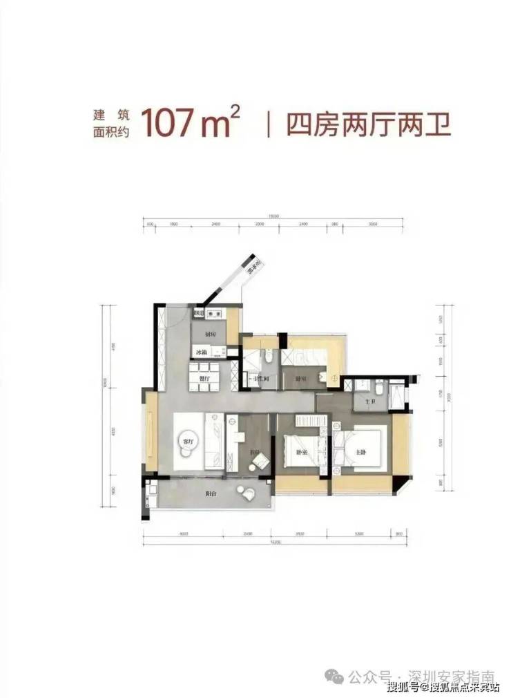 107㎡的4房2厅2卫,设计的是经典竖厅格局,客厅4米开间,LDKB一体化,S墙设计预留冰箱卡槽位,动静分区,分别做到了主卧17.18㎡/次卧11.2㎡/次卧8.64m²/次卧7.68㎡(包含墙体飘窗),U型厨房,卫生间干湿分离,得房率约79.6%(不含赠送),客厅连接次卧出10.24m²观景大阳台,东南朝向。套内面积85.19m²+赠送面积22.96m²=实用面积108.15m²,加上赠送面积后得房率101.08%。