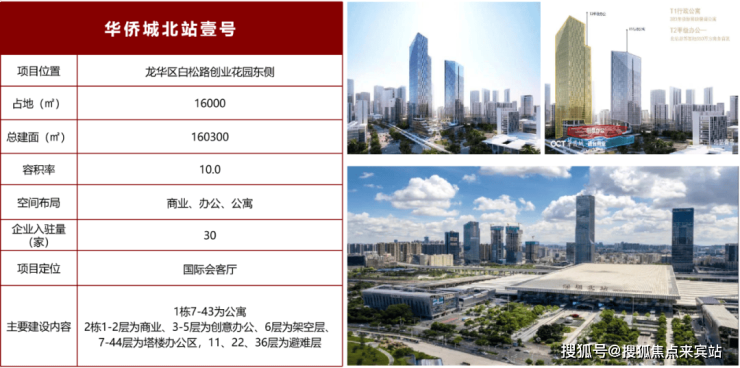 华侨城北站壹号位于龙华区白松路创业花园东侧,项目占地面积为16000㎡,建筑面积为160300㎡,容积率为10.0,园区已入驻30家企业。