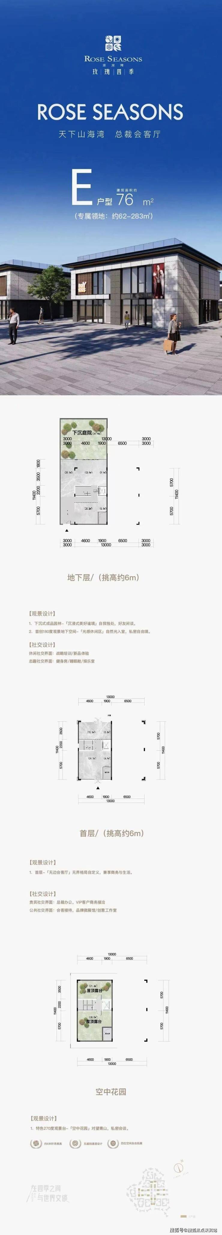 【五大创新设计 只为峯层定制】1. 约6米轩昂挑高,容得下您收藏的瑰丽之作2. 整体无遮挡通透设计,四位空间自由拓展无限可能3. 特色270度观景台,一面瞭望三山一谷,一面尽揽繁华商街4. 在可容10000朵玫瑰的宏大独立花园,饮茶晤面漫谈商场风云5. 首创180度观景地下空间,惬享下沉式成品园林