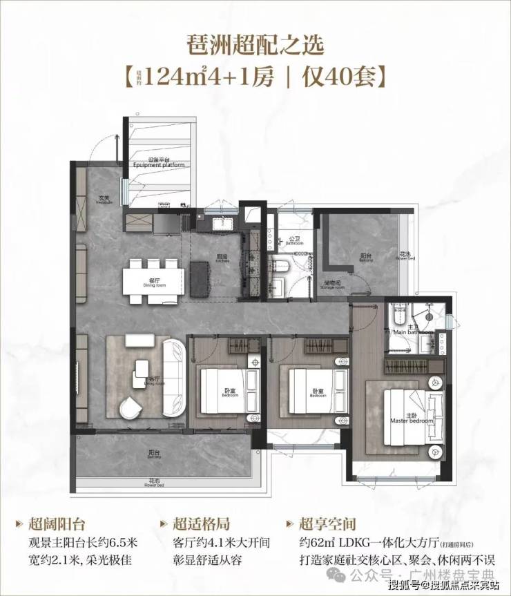 建面131平4+1房,该户型跟之前142平户型有点像,南北对流双阳台,主阳台长达7.5米,约4.6米的客厅开间,加上设备平台的赠送,空间感完全不输160平。