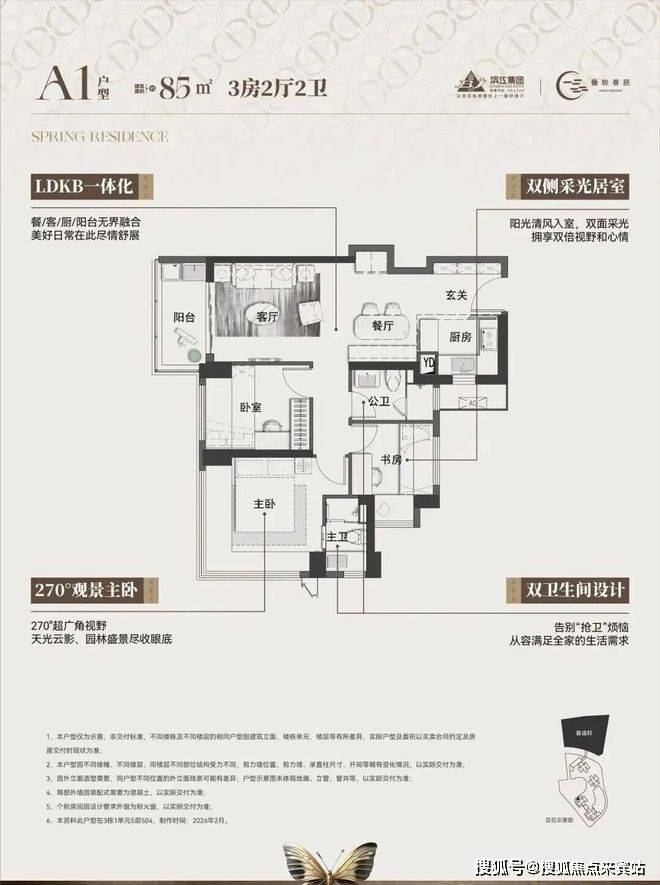 本次首推的主力中的主力。在85㎡面积段做到三房两卫,功能性极强。如果客厅开间能做到约3.3米,主卧带独立卫浴, 对房间数有硬性要求、预算在300-330万左右的家庭相当友好。