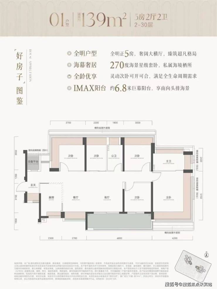 设计上做到80%南向全明大面宽户型,270度采光面,层高约3.15米。阳台面宽起步就是约6.3米,最宽做到约6.8米,把山海景观资源尽可能容纳。