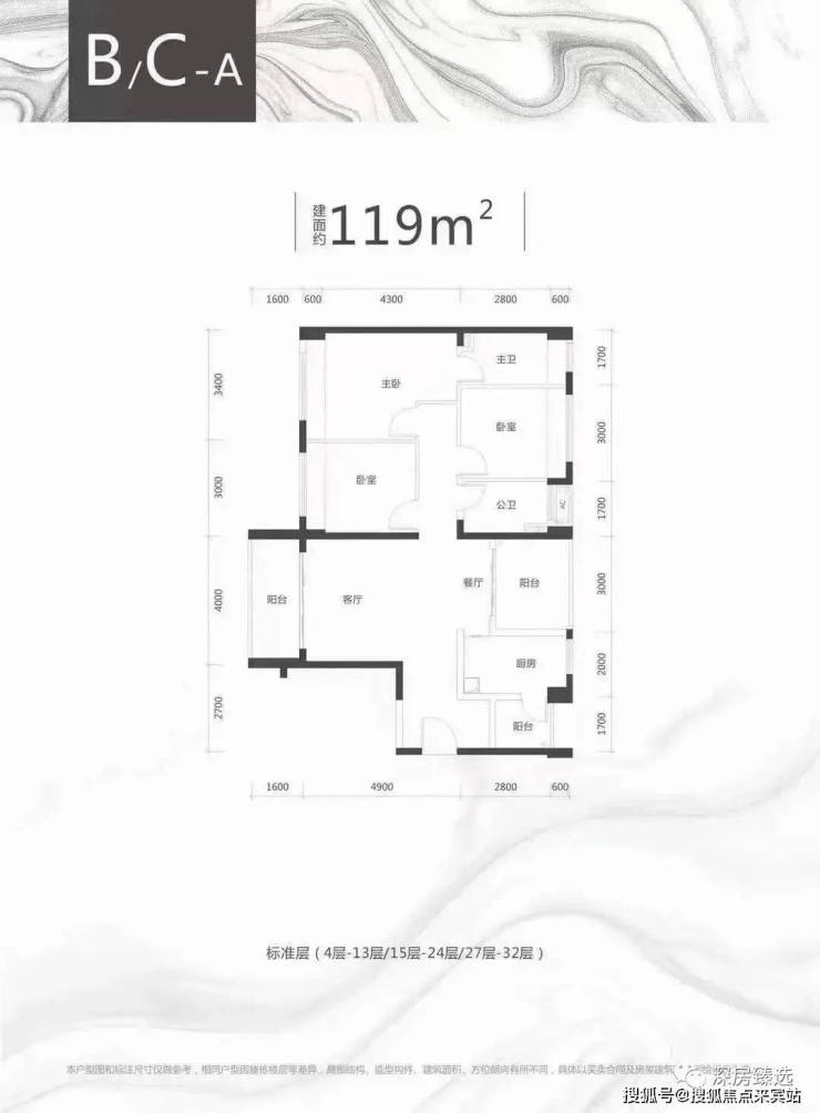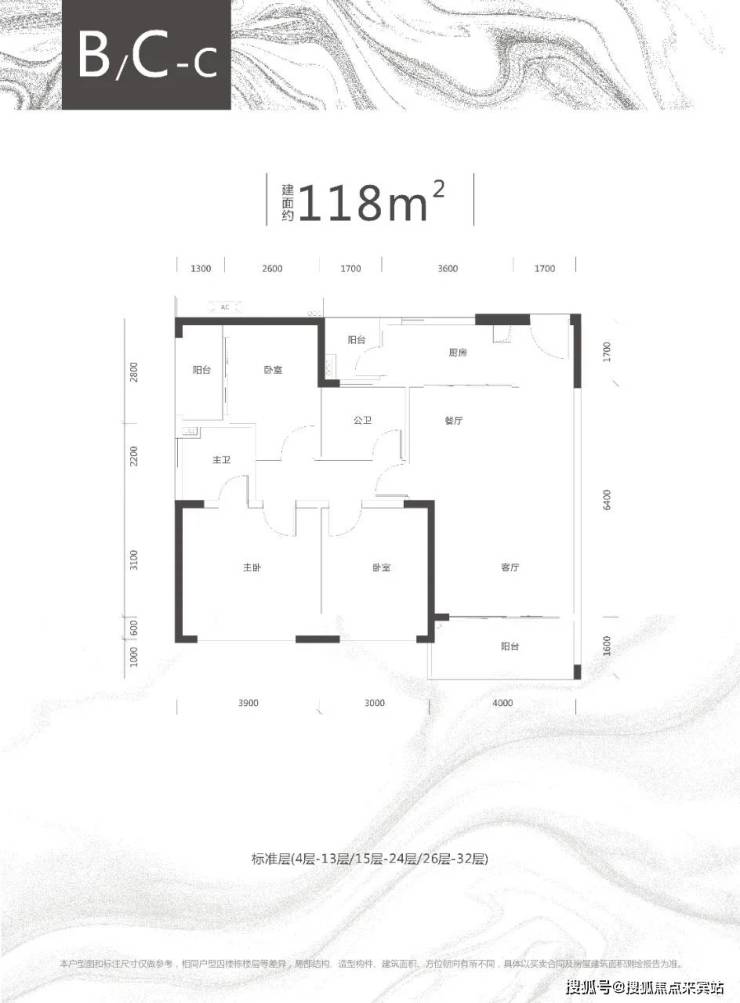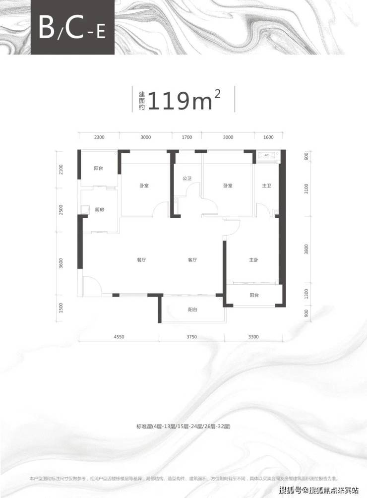 B/C栋:3梯5户,34层,100-119㎡舒适户型