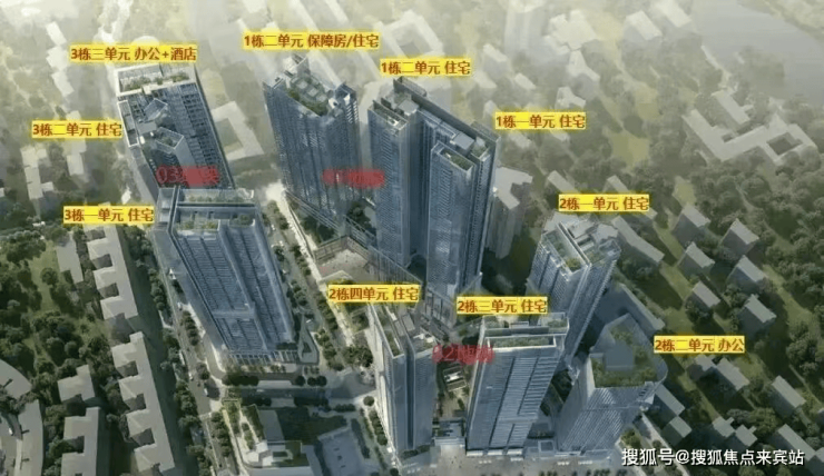 总共由4栋超高层塔楼组成,其中2栋2单元为26层的办公楼,2栋1、3、4单元分别为54、51、53层的住宅楼。住宅套数共872套(回迁544套+可售328套),提供停车位747个。