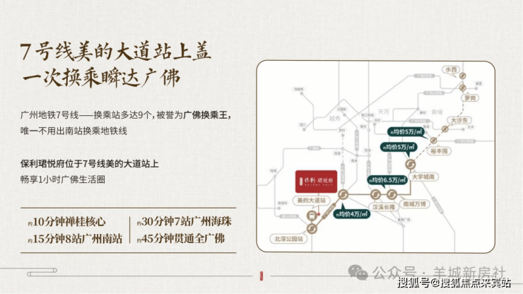 :7号线美的大道站D出口直达,1站换乘佛山3号线,30分钟直达广州南站(广佛交界),40分钟通达珠江新城;